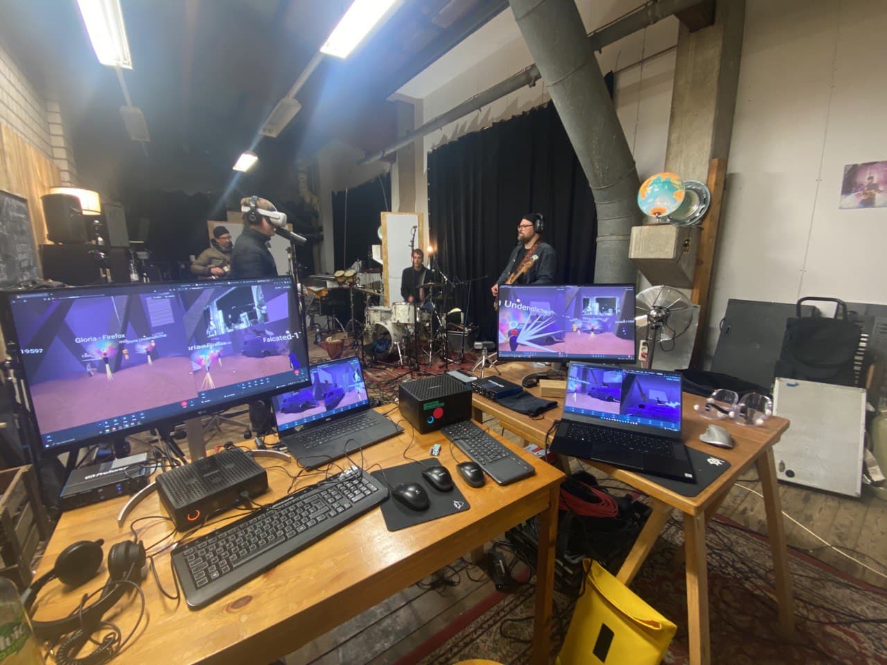 Messer is a post-punk band. Their concerts live from a rough atmosphere, in which the music and the lyrics of Hendrik Otremba can push forward. Really close to the people. How is something like that supposed to work in a digital space simulated on a computer screen? Gloria took on this challenge and, together with Messer and Jenny Bohn from the Digital Burg - Centre for Literature Burg Hülshoff, designed a digital implementation: The band has to be present as avatars in the room and play live. On the one hand, the singer as the main communicator with the audience should be present in the VR space himself in order to perceive the avatars of the audience as spatially as possible. And he should also be present in the audience as a moving avatar with hand movements, so that people feel that he is singing live to them.
