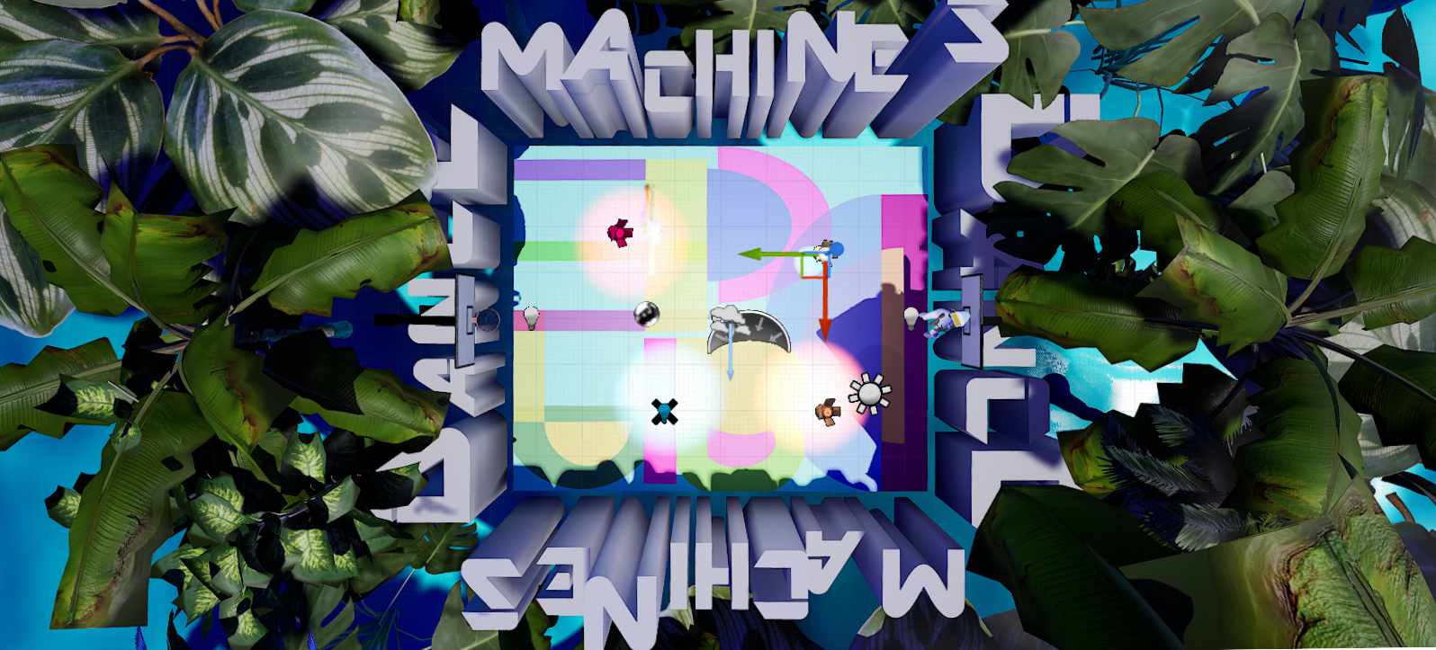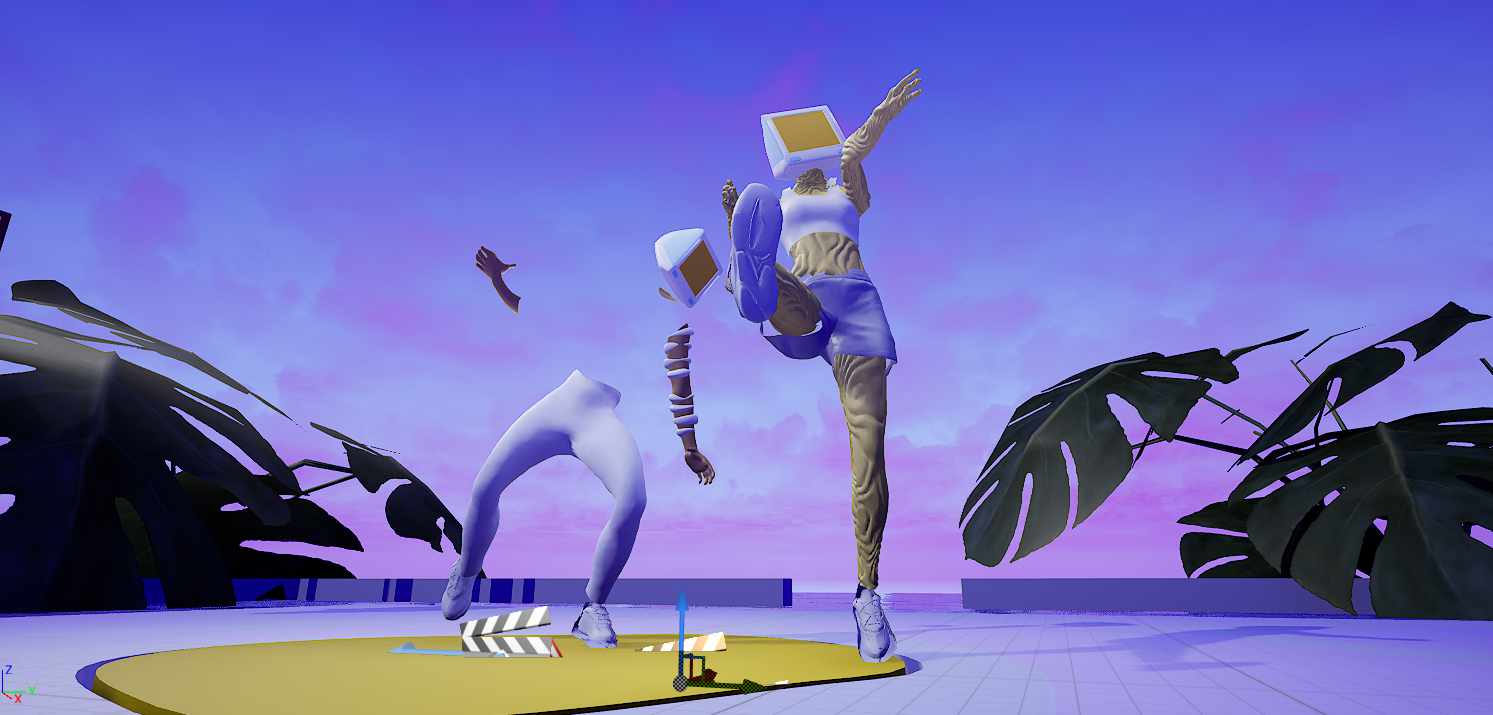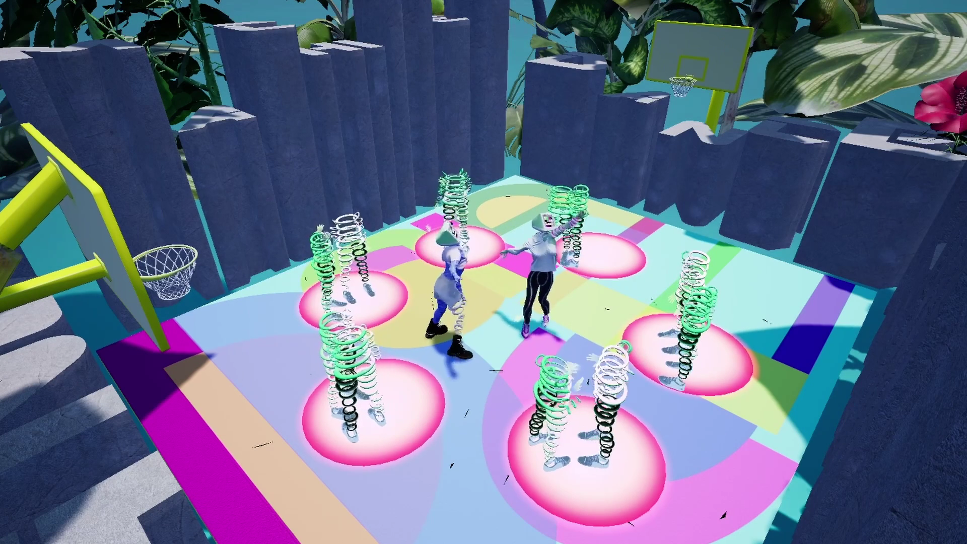 The landscape, called a "map" in technical language, physically corresponds to the floor and walls of the analog space, but the design does not. Digital technology director, developer and designer Gloria Schulz worked with set designer Doris Margarete Schmidt to create an open basketball court in a tropical island setting. Palm trees tower in a tropical evening sky and you can hear birds and the sea.