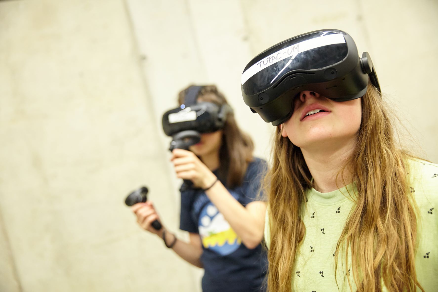 12 people are in a room wearing Vive Focus 3 headsets. They enter a virtual room that is congruent with the physical room (floor, walls and objects are congruent in VR and analog) and they see each other in real time as avatars.