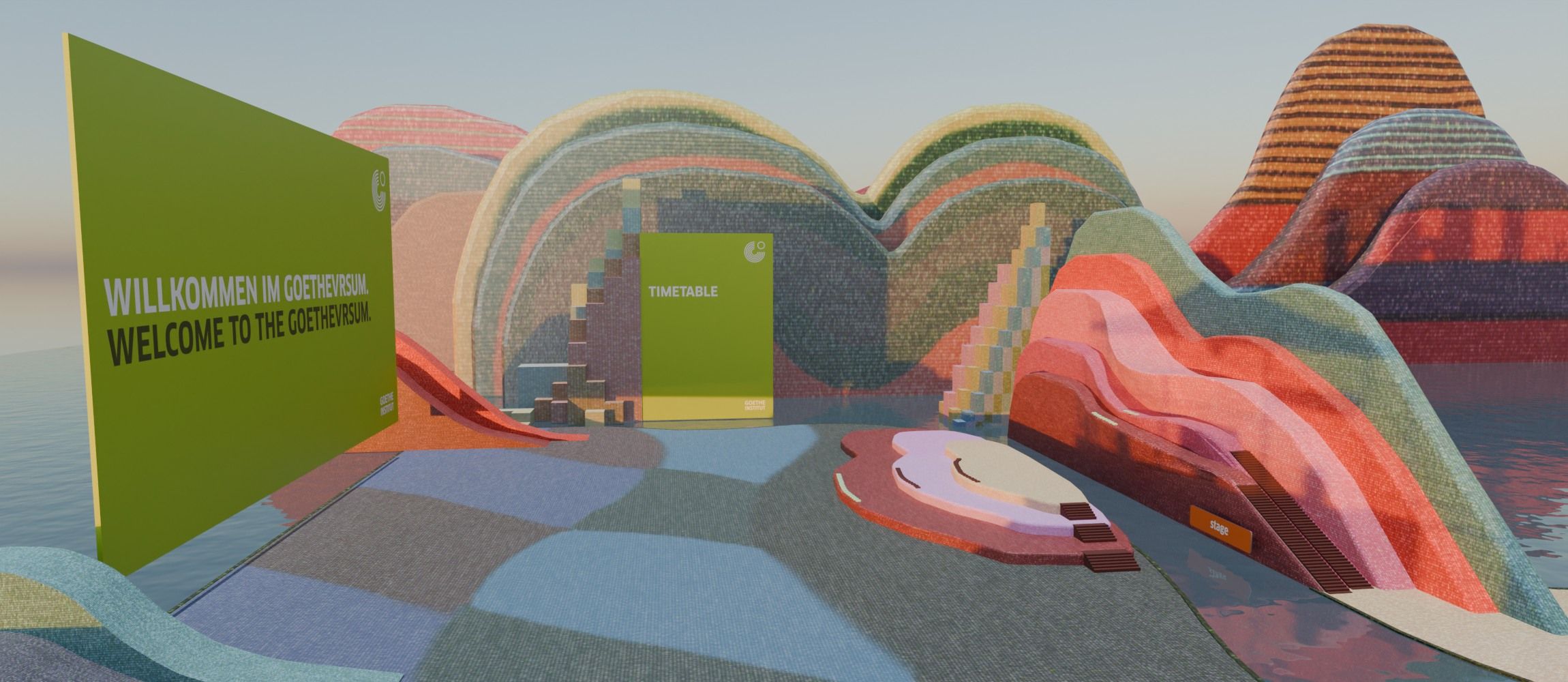 "The GoetheVRsum is a virtual 3D environment in which you can meet other people. You can think of the GoetheVRsum as a multiplayer game. In this environment, you move around with a personalized avatar and explore different rooms. You can travel interactively and immersively, discover and try out new formats in the fields of culture, language, education and creativity and have a lot of fun. The design takes the works of the Bauhaus artists as a source of inspiration and interprets them in a playful and contemporary way."- this is how the project is described on the landing page of the Goethe-Institut. Click here for the Landind Page.