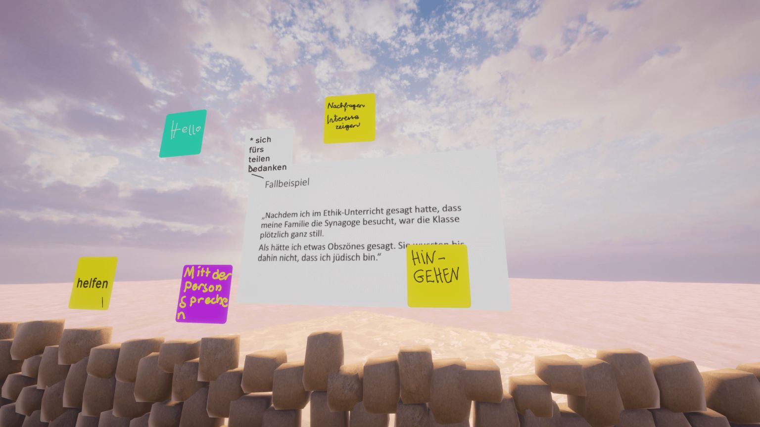 There is a lot of media content on the Internet that conveys discrimination, prejudice and hatred. Antisemitic content is often conveyed through seemingly harmless terms and images that can be decoded with experience. This makes it possible to spread anti-Semitism without directly being prosecuted or risking social ostracism. Where and how can young people find the time, resources, and motivation to truly engage with this complex topic? Commissioned by KULA Compagnie and in close collaboration with the Berlin School of VR, we have designed and produced a virtual space that enables just that!